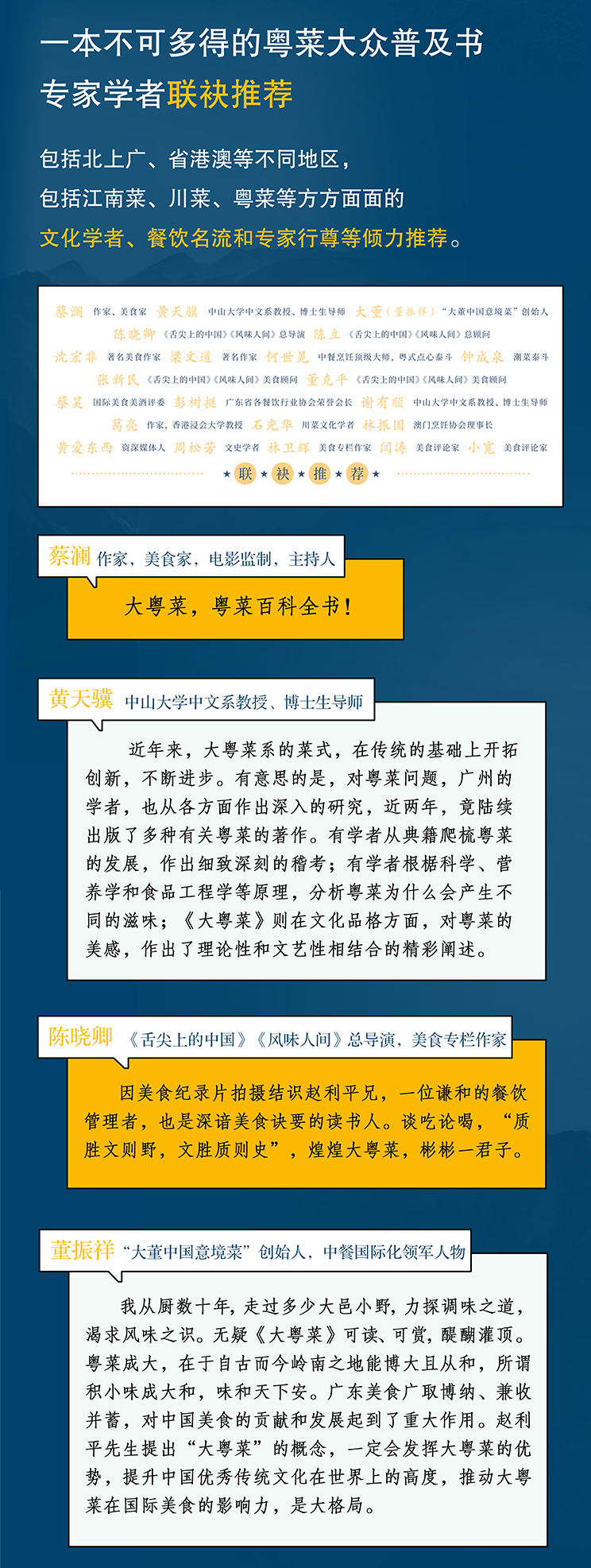 《舌尖上的中国》《风味人间》总导演陈晓卿评价,赵利平不仅是一位谦和的餐饮管理者,也是深谙美食诀要的读书人。“谈吃论喝,‘质胜文则野,文胜质则史’,煌煌大粤菜,彬彬一君子。”这些名家推荐内容将以摘编形式随书刊发。