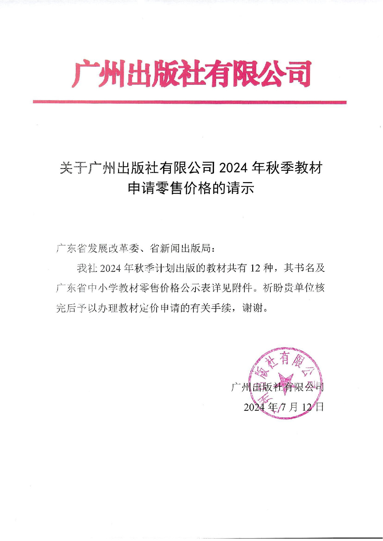 关于乐竞体育·(中国)官方网站有限公司2024年秋季教材申请零售价格的请示