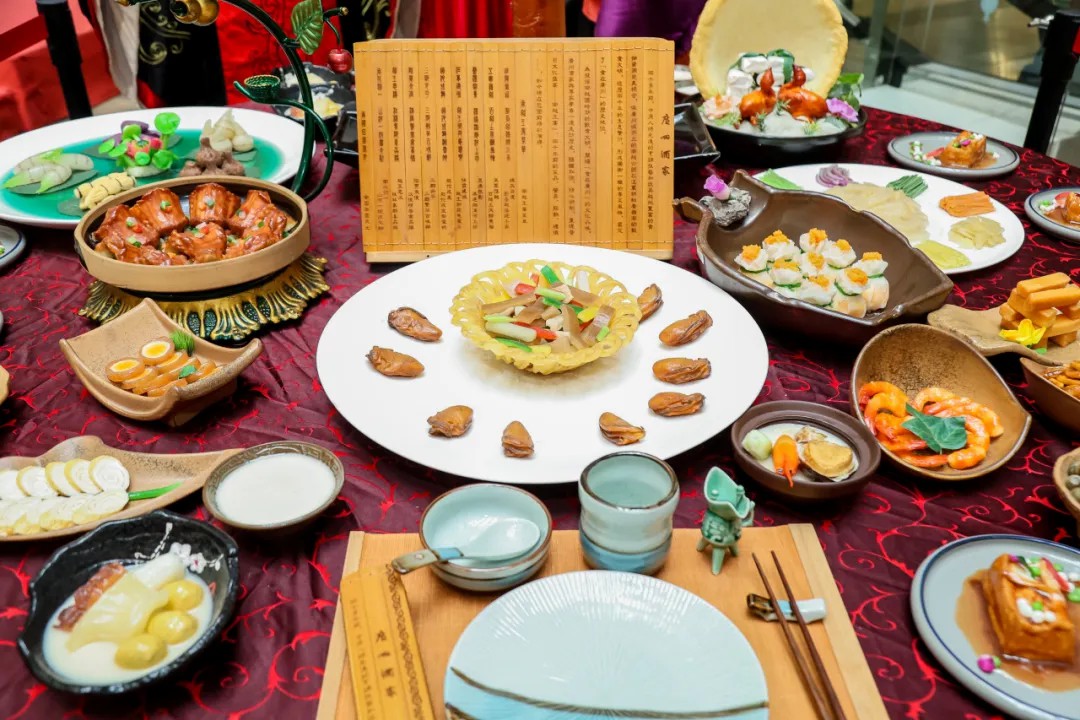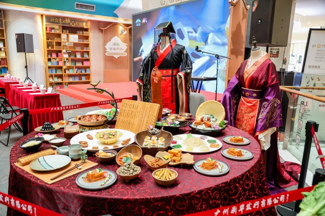 活动现场,一桌复刻“南越王宴”仿真宴席成为焦点。“南越王宴”以南越王时期的菜肴为基础,历时10年时间,在权威学者和考古专家的指导下开发,对粤菜本源进行深入挖掘、研究论证,从菜品、餐具、服饰、礼仪、典故、音乐和场景等全方位复刻。鎏金铜鼎盛着“烤乳猪”的焦香,漆器耳杯斟满“荔枝蜜”的清甜,南越王宴以饮食文化为核心,追溯粤菜起源与岭南饮食传统。每一道菜肴都是活的文字,在人间烟火中翻动岁月的书页,于三餐四季里读懂广州。